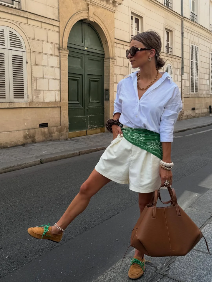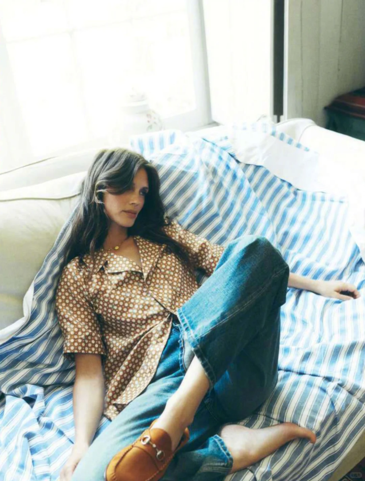脚下的棕色乐福鞋则与衬衫形成巧妙呼应,