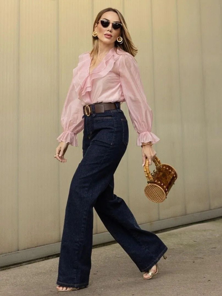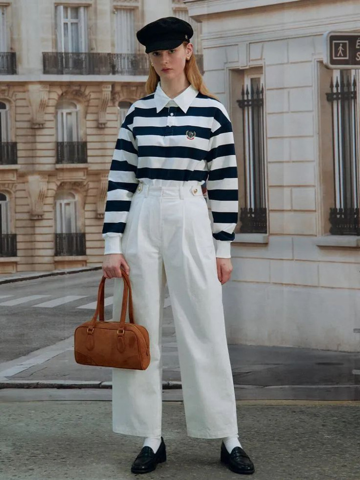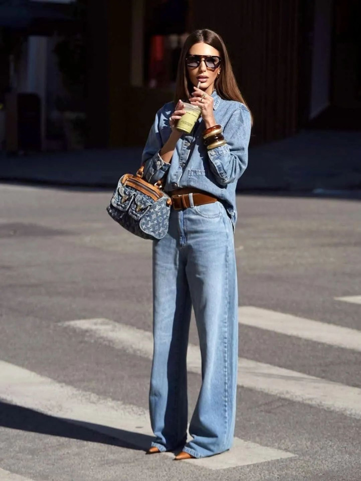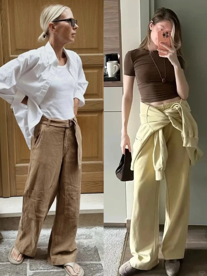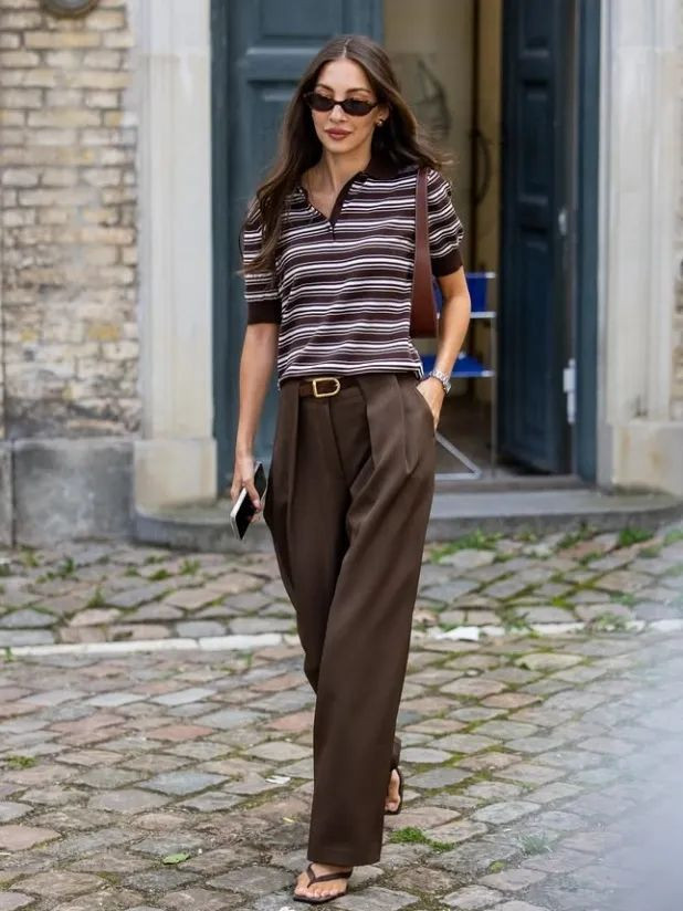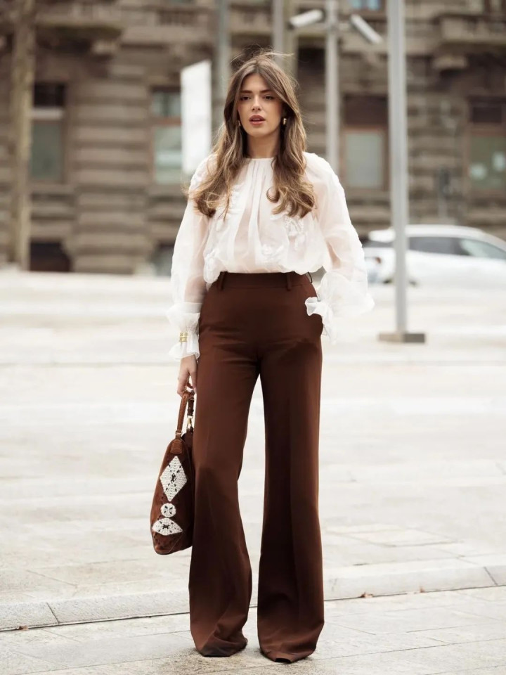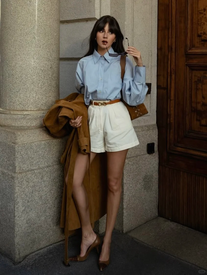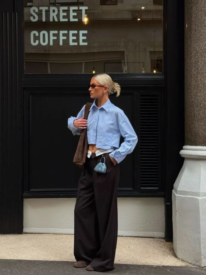 浅蓝色衬衫搭配浅棕色阔腿裤,