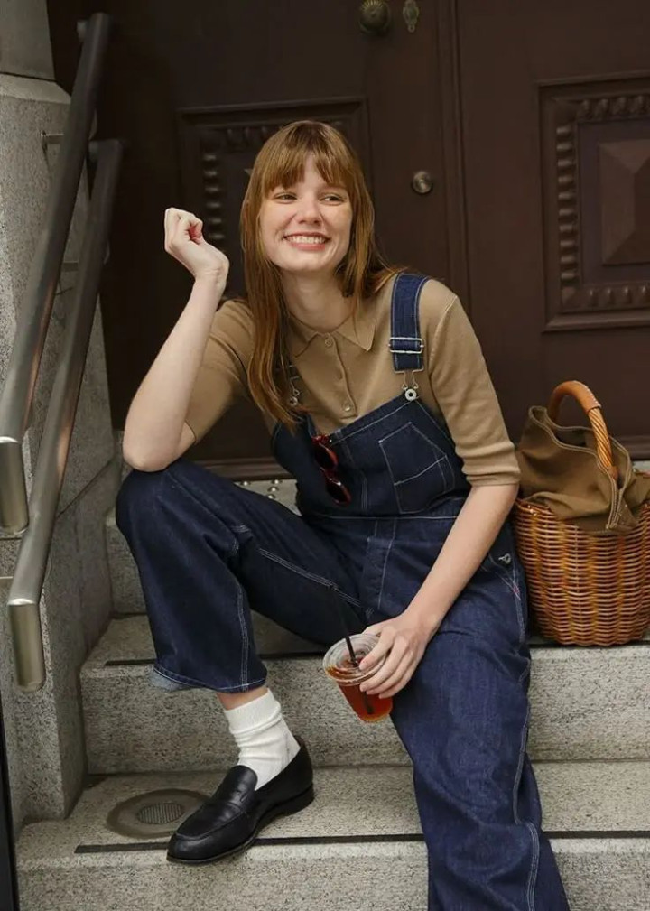 棕色Polo针织衫搭配蓝色牛仔背带裤,